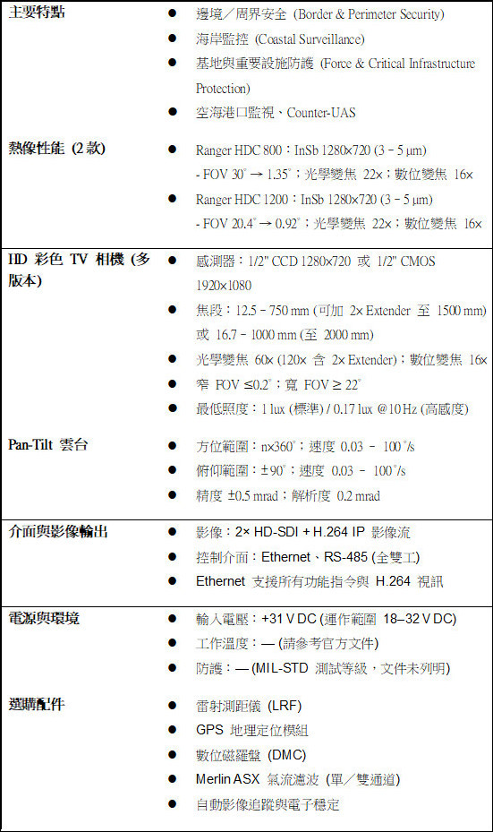 邊境與周界安全 (Border & Perimeter Security)海岸監控 (Coastal Surveillance)基地/重要設施防護 (Force & Critical Infrastructure Protection)空海港口監視、Counter UAS
