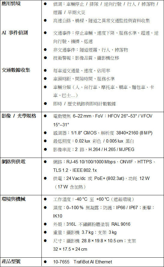 8 MP / 4K 超高解析度影像,優異低照度與 120 dB 寬動態範圍,無拖影與眩光嵌入式深度學習 AI 與 3D 追蹤技術,提供高精度事件偵測與 交通數據即時 + 歷史交通數據、即時計數與軌跡輸出堅固 IP66/67、IK10 等級 316L 不鏽鋼外殼,快速安裝於惡劣環境