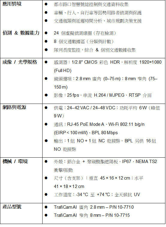 Full HD 視覺感測器搭載前端 AI,夜間與惡劣天候亦提供精準車輛檢測 自動檢測並分類各類道路使用者,並擷取車輛軌跡資料 即時 API 整合,支援智慧號誌自動調節與交通預測 虛擬偵測線圈與乾接點輸出,可直接連接交通控制器 Acyclica 平台自動報告與熱區圖,協助識別瓶頸與安全隱患 PoE、Wi Fi 或 BPL (電力線) 連線,IP67 鋁合金外殼整合遮陽板