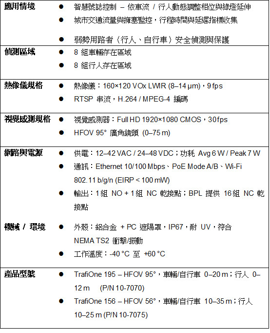 熱影像 + Wi Fi 雙技術,24/7 偵測車輛、行人與自行車並動態調節號誌 自動捕捉高解析度交通數據:流量、速度、佔用率、行程/延遲時間 Wi Fi MAC 追蹤可量測路段行程時間、交叉口排隊與延遲 虛擬偵測區與乾接點輸出,可直接整合交通控制器或 TCP/IP 網路 雲端 ITS IQ 平台自動化儀表板與報告,協助瓶頸分析與安全評估 緊湊 IP67 鋁製外殼,PoE / Wi Fi / 電力線 (BPL) 安裝快速簡便