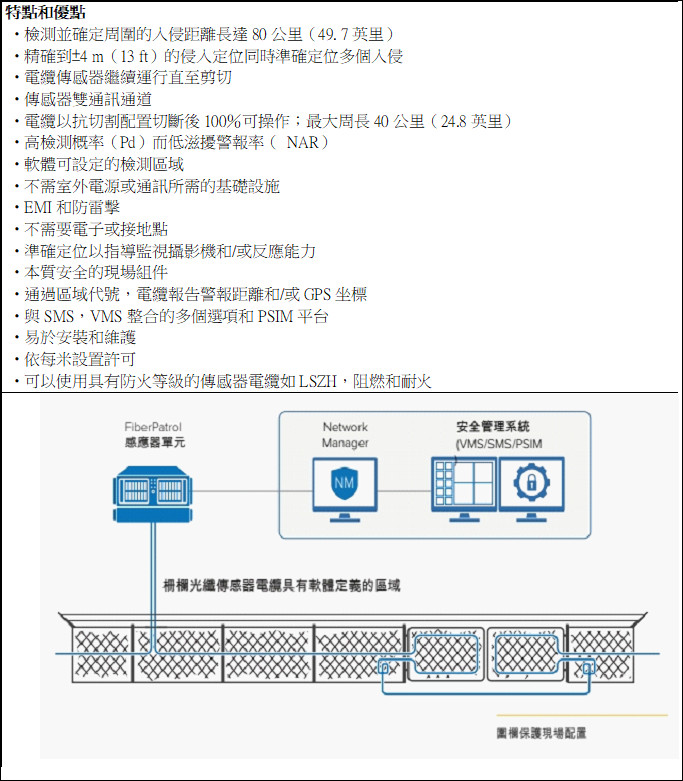 檢測並確定周圍的入侵距離長達80公里(49. 7英里) 精確到 ±4 m(13 ft)的侵入定位 傳感器雙通訊通道 同時準確定位多個入侵