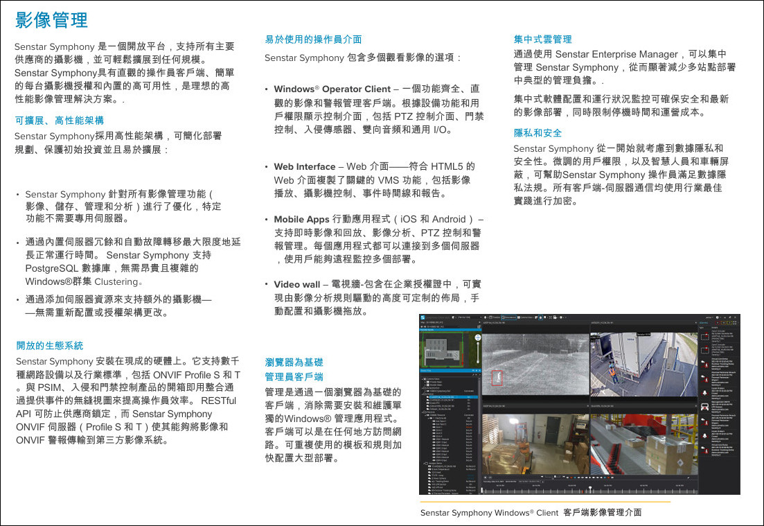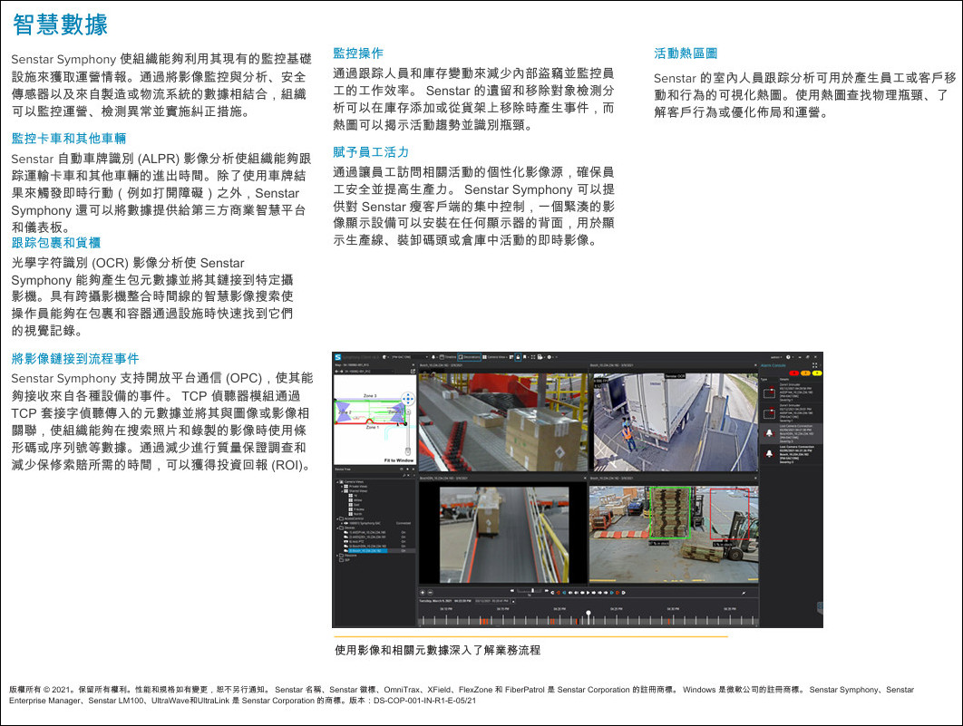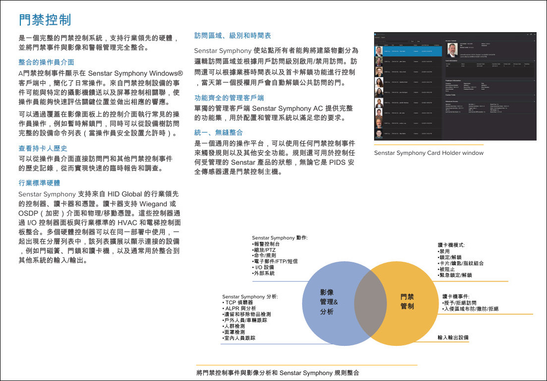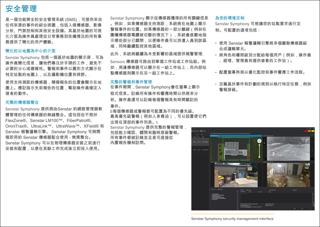 Senstar Symphony 通用操作平台包括企業級影像管理、影像分析、安全管理、 門禁控制和數據智慧模組。為平台提供動力的是傳感器融合引擎,它將低階傳 感器數據與影像分析智慧地結合起來,以實現最高水平的性能,遠遠超過單個 傳感器的性能。