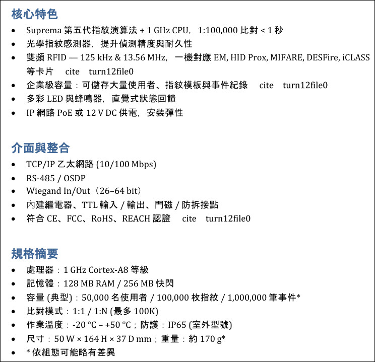 BioEntry P2 為 Suprema 新一代指紋門禁控制器,內建 1 GHz 高效處理器與最新 指紋演算法,在精巧直式機身中提供高速比對與高安全性。裝置同時支援雙頻 RFID(125 kHz + 13.56 MHz)多卡技術,搭配彈性的網路與 I/O 介面,可滿足大小型場域的 IP 門禁需求